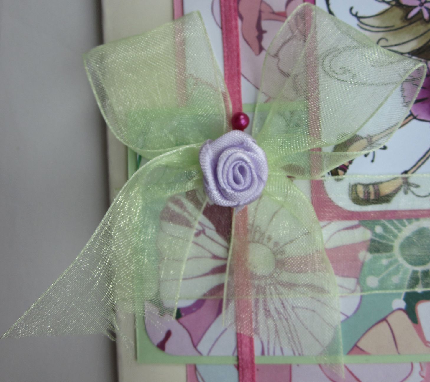 Lovely card! Great coloring of that cute image.! I love your papers and your ribbons, too. :^)